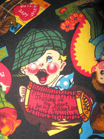 Looking through my fabric cupboard I happened upon this delightful fabric with vintage Valentine cards on it. I've had it for years, probably bought on sale after Valentine's Day, and I've never used it. Click on the image to see it larger or follow on Feedly and look at it there. (Feedly makes the photos large enough to see details.) Oh, and I took a few photos of some of the "cards" which you can see below.